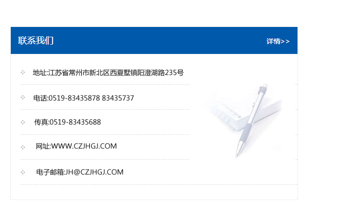 地址:常州市新北區友邦商務大廈1幢16、17層  電話:0519-85101652  傳真:0519-85112595  郵編:213022  網址:www_cz-jiayue_cn.fulin-sz.com  郵箱:xiajifengaa@163.com
